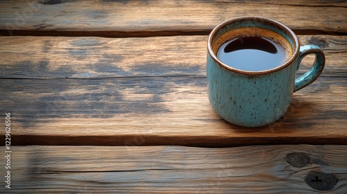 Rustic wood table, teal coffee mug, dark drink, morning beverage