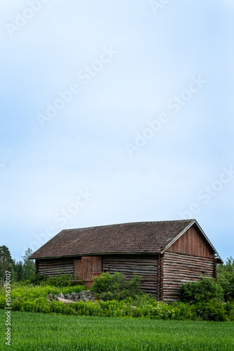 grass, nature, log, meadow, structure, door, agriculture, timber, barn, closed, roof, architecture, farm, gable, traditional, wood, wooden door, landscape, shingle, wooden, old, bush, storage, overcast, rural, weathered, vegetation, cloud, plant, countryside, surrounding, sloping, scenery, outbuilding, greenery, building, history, heritage, sky, daytime, exterior, rustic, field