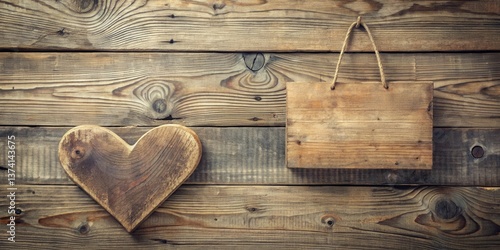 Rustic Wooden Heart and Blank Signboard on Weathered Planks for Sentimental Message or Rustic Design