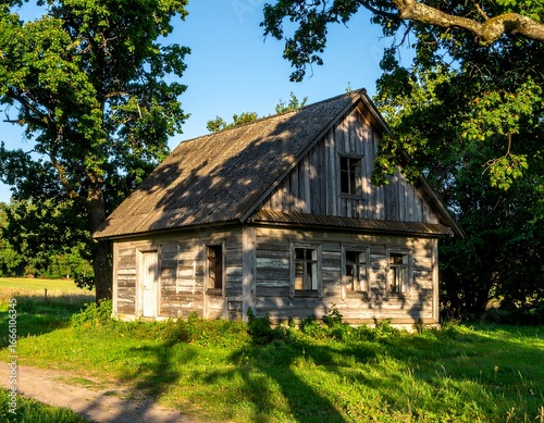 house, wooden, rustic, old, summer, field, tree, shadow, sun, light, grey, green, grass, country, rural, exterior, nature, calm, peace, simple, isolated, bungalow, building, landscape, daylight, peaceful, countryside, open, still, vintage