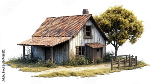 Rustic wooden house with rusty roof, overgrown yard, and small tree, isolated on white background.