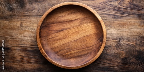 Rustic wooden plate centered on a rich brown wood tabletop with textured grains showcasing ample negative space for table setting designs
