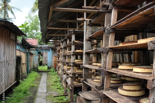 Rustic wooden racks with traditional cheese wheels aging in open village hut