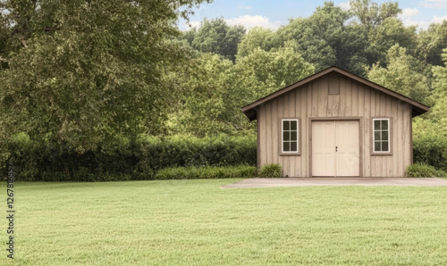Rustic wooden shed in a spacious green field surrounded by trees on a sunny day