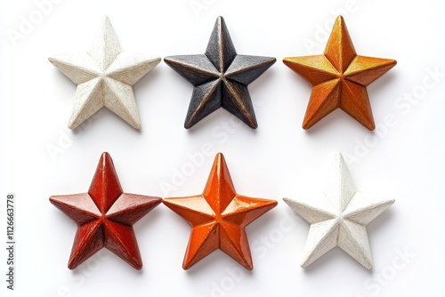 Rustic wooden stars in various colors including white, brown, and orange arranged on a white background, ideal for decorative illustrations and rustic-themed advertisements.