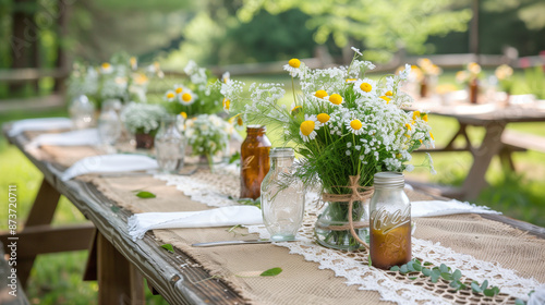 Rustic wooden table adorned with burlap and lace, mason jars of wildflowers, embodying the charm of country chic aesthetic