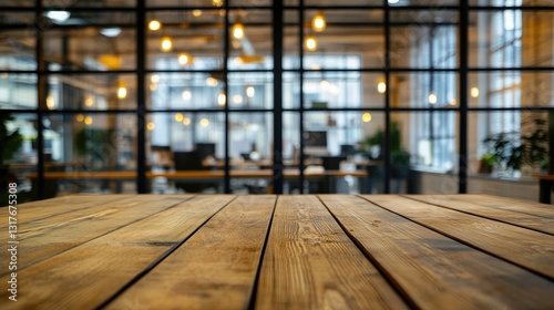 Rustic wooden table with a blurred modern office interior featuring glass partitions and warm lighting. Ideal for business branding, workspace presentations, and product displays