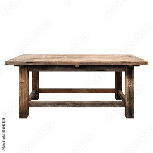 Rustic wooden table with a worn surface and sturdy legs isolated on transparent background
