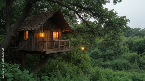 Rustic Wooden Tree House in Lush Forest at Dusk