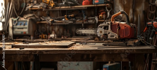 chain saw, workshop, tool, sawdust, workbench, carpenter's shop, rustic, equipment, tied-up, sunlight, work, woodwork, carpenter's shop, saw, wooden, bench, shelf, background, professional, craftsman, timber, craft, labor, industrial, indoor, repair, machinery, manual, tool, blade, garage, bricolage, workspace, maintenance, construction, detailed, hardware, hand tool, environment, craftsmanship, home