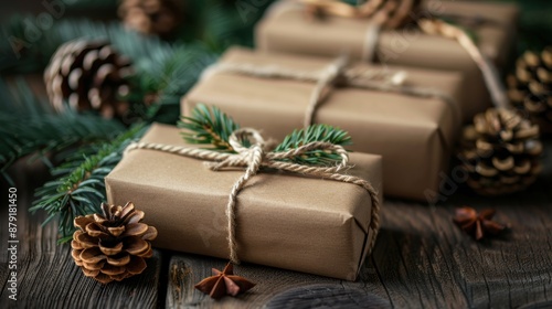Rustic wrapped gifts adorned with twine and pine cones, set against a festive background, embodying a natural holiday charm.