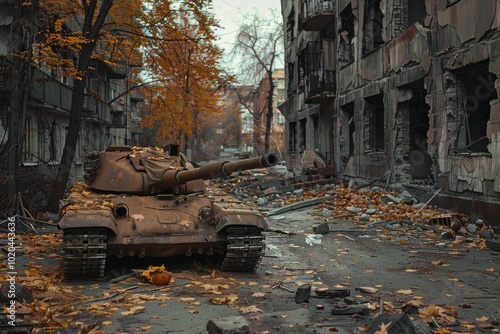 Rusting tank in a war-torn city street, surrounded by autumn leaves and debris, portraying the harsh aftermath of conflict.
