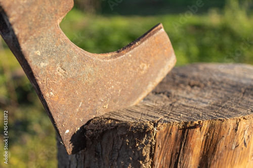 tree, rust-eaten, log, axe, sharp, timbering, wooden, hatchet, old, block, axe, closeup, outside, green, cutter, timber, wood, lumberjack, equipment, firewood, tool, object, cut, handle, blade, nature, stump, work, isolated, close