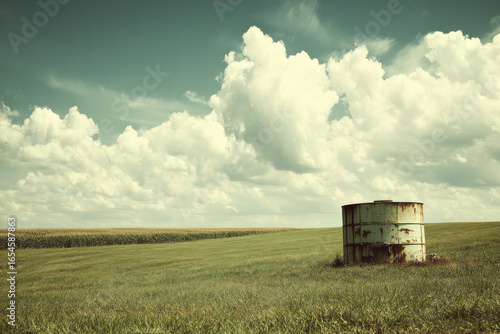 barrel, rust-eaten, grass, field, sky, cloud, landscape, environment, bio-fuel, nature, outdoors, rural, countryside, agriculture, horizon, weather, overcast, metal, container, pollution, waste, recycling, sustainability, green, energy, farm, meadow, pasture, scenic, tranquil, serene, open, space, cloudscape, atmospheric, land, earth, natural, skyward