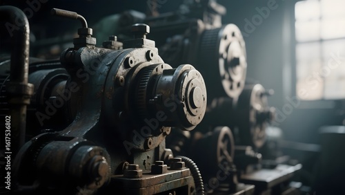 Rusty Industrial Machinery in a Dimly Lit Factory