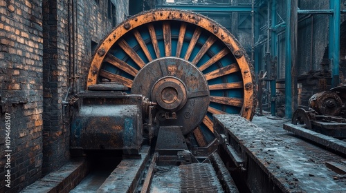 wheel, rust-eaten, industrial, factory, abandoned, metal, machinery, gear, cog, steel, engine, shaft, drive, power, production, manufacturing, heavy, equipment, large, old, grunge, worn, weathered, aged, derelict, forgotten, silent, dark, shadow, brick, grime, dust, track, rail, floor, empty, space, broken, decay, ruin, urban, exploration, relic, history, past, time