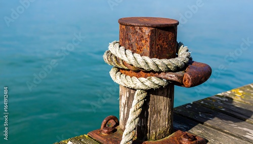 mooring, post, rust-eaten, rope, tied, dock, wooden, pier, water, lake, nautical, harbor, boat, tied-up, sunlight, calm, blue, green, metal, metalwork, detail, nature, sea, ship, calm water, navigation, equipment, support, secure, fastened, knot, texture, wood, aged, closeup, perspective, exterior, landscape, marin
