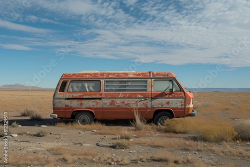 camper, van, desert, abandoned, vintage, rustic, travel, nomad, adventure, vehicle, landscape, arid, nature, sky, blue, clear, outdoors, journey, exploration, road, trip, desolation, solitude, peace, quiet, wilderness, remote, scenic, view, horizon, day, transport, retro, holiday, expedition, tour tourism, environment, mobile, home, rust, weathered, old, dry, barren, calmness, freedom, escape, wanderlust