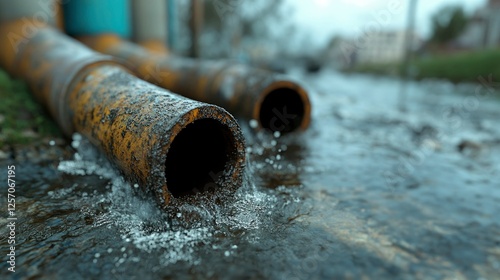 sewage, creek, stream, pollution, rusty metal, flowing water, closeup, texture, detail, grunge, industrial, urban, city, environment, ecology, environmental issue, problem, crisis, decay, deterioration, aged