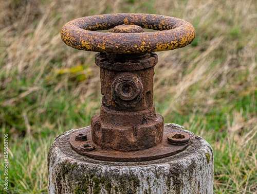 valva, rust, metal, weathered, corrosion, outdoors, field, grass, old, aged, decay, industrial, structure, iron, round, pipe, control, mechanism, handle, yellow, brown, texture, surface, nature, environment, concrete, moss, bolt, secured, exterior, equipment, abandoned, forgotten, rural, vintage