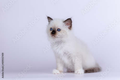 Sacred Birman kitten shocolate point color, birma Cat isolated on a white background, studio photo.