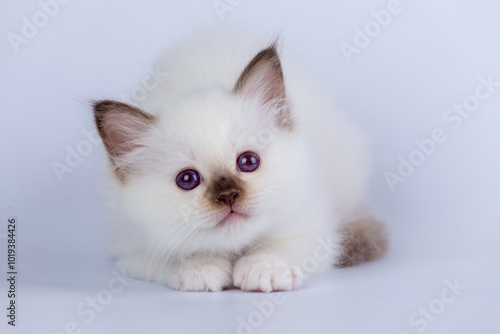 Sacred Birman kitten shocolate point color, birma Cat isolated on a white background, studio photo
