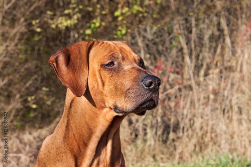 Sad dog eyes. Rhodesian ridgeback portrait. Beautiful Rhodesian ridgeback dog portrait. Looking into the eyes of the dog.