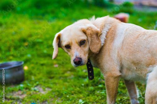 dog, house, chain, leash, guard, cute, animal, home, domestic, pet, protection, security, kennel, brown, yard, mammal, canino, nature, village, near, white, life, beautiful, sad, portrait, grass, looking, eye, dirty, tranquil, concept, collar, watching, depression, sorrowful, paw, keep, snout, hound, booth, background, old, 1, head, outside, look, up