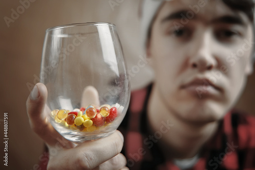 Sad guy holding a glass of pills and drugs. Treatment and prevention in quarantine. Sick man.