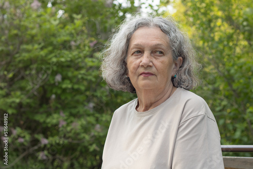 Sad lonely old woman reflects on outdoor life. Wrinkles on the face, gray hair. Retirement age