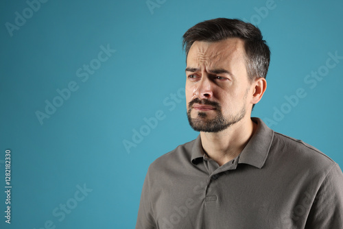Sad man crying on light blue background, space for text