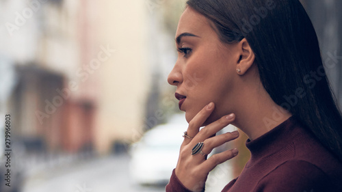 street, portrait, hair, coiffure, 20s, posing, beautiful, face, road, alley, young, woman, people, girl, urban, city, person, female, summer, outdoors, pretty, adult, attractive, europa, caucasian, lady, outside, town, spring, autumn, fall, cute, european, style, brunette, sad, depressed, problem, issue, grieved, bored, single, alone, 1, thinking, pressure, stress