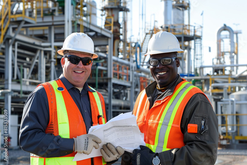 Safety & Efficiency Experts Two engineers ensuring top-notch operational standards at the oil factory.