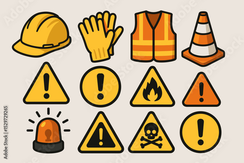 safety, equipment, icon, construction, warning, hazard, signs, work, protection, industrial, set, vector, helmet, hard hat, danger, symbol, caution, vest, glove, cone, illustration, industry, occupational, health, risk, personal, protective, emergency, traffic, attention, toxic, fire, skull, pictogram, sticker, hazardous, isolated, flat, gear, security, alert, flammable, road, light, beacon