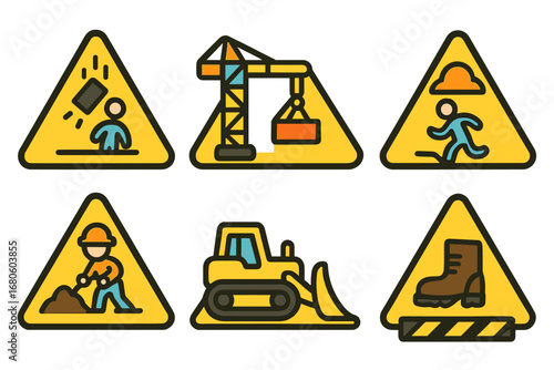 safety, icon, for, children, flat, vector, mini, illustration, construction, danger, signs, colours, children, falling, object, crane, operation, hard, hat, uneven, surface, roadwork, machinery, use, caution, tape