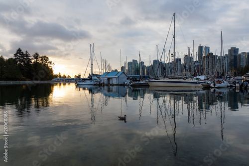 Sail Boats in a marina during a vibrant sunrise. Taken in Stanley Park, Coal Harbour, Downtown Vancouver, BC, Canada.