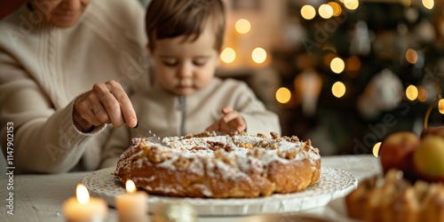 Saint Basil's Day. A cozy family moment with a child and adult cutting a powdered cake together, creating a warm and intimate holiday atmosphere.