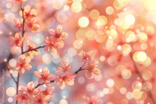 sakura blossoms background with bokeh, bokeh, blossoms and trees, in the style of pink and amber