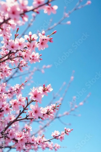Sakura tree branches stretching towards clear blue sky, serene, airy, sky
