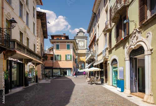 gardasee, inner city, shopping street, italy, lombardia, tower, watch, street, architecture, city, building, house, europa