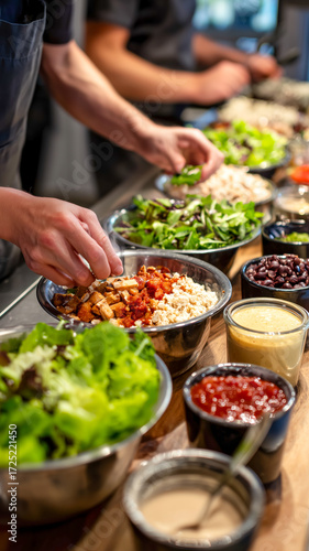 Salad preparation: A culinary professional assembles a colorful salad with fresh ingredients, showcasing healthy and delicious food.