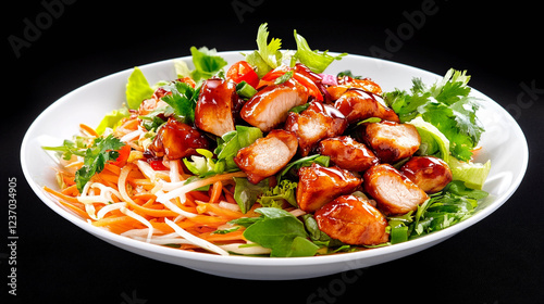 salad, chicken, glaze, sauce, herb, lettuce, parsley, cilantro, carrot, cabbage, vegetable, white plate, black background, food, dish, cooking, asian cuisine, dressing, receipe, healthy eating, diet, protein, vitamin, delicious, fresh, appetising, satisfying, lunch, meat