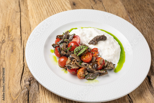 Salad with fried seasonal mushrooms, cherry tomatoes, stracciatella