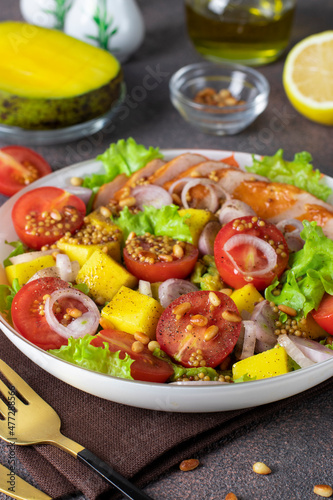 Salad with mango, smoked chicken and cherry tomatoes served with green lettuce leaves in a plate on a brown background