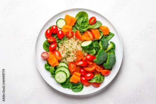 Salad with quinoa, spinach, broccoli, tomatoes, cucumbers and carrots.