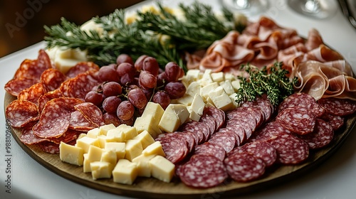 salami, cheese, grape, prosciutto, platter, food, party, snack, charcuterie, meat, cured, deli, epicure, dining, serving, tray, wooden, board, rosemary, herb, thyme, red, green, white, culinary, delicious, savoury, widener, elegant, festive, table, dinner, brunch, lunch
