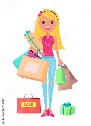 sale, shopaholic, girl, bag, vector, illustration, fashion, lady, lifestyle, female, modern, clothes, shop, young, stylish, slim, buy, client, background, glamour, commerce, person, pursed, elegant, model, package, joy, boutique, style, buyer, red, consumerism, hair, smile, woman, white, packet, shopping, holiday, clothing, artistic, isolated, design, leisure, present, gift, ribbon, bow, blond, title