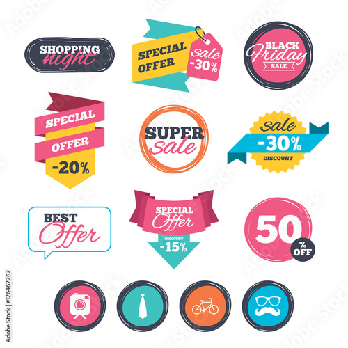 Sale stickers, online shopping. Hipster photo camera with mustache icon. Glasses and tie symbols. Bicycle family vehicle sign. Website badges. Black friday. Vector