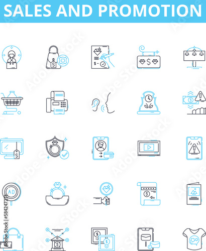 Sales and promotion vector line icons set. Sales, Promotion, Advertising, Marketing, Prospecting, Lead-Generation, Networking illustration outline concept symbols and signs