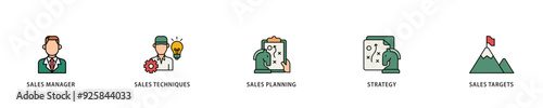 Sales management icon infographic illustration concept with icon of manager, sales techniques, planning, strategy, and targets icon live stroke and easy to edit